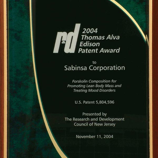 Sabinsa received the Research & Development Council of New Jersey’s 2004 Thomas Alva Edison Patent Award in the Consumer/Small Company category. The award recognized the innovation in developing ForsLean® ingredient and honored its U.S. patent (No. 5,804,596). The patent covers methods of preparing Coleus forskohlii for use in promoting lean body mass and treating mood disorders.